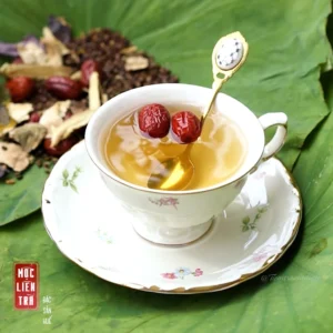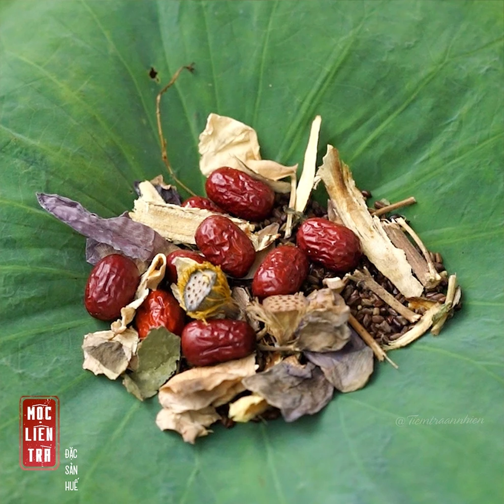 Thành phần: Cánh hoa sen, lá sen, nhị sen , tâm sen, kì tử, hoa hòe, thảo quyết, táo đỏ, cam thảo, long nhãn